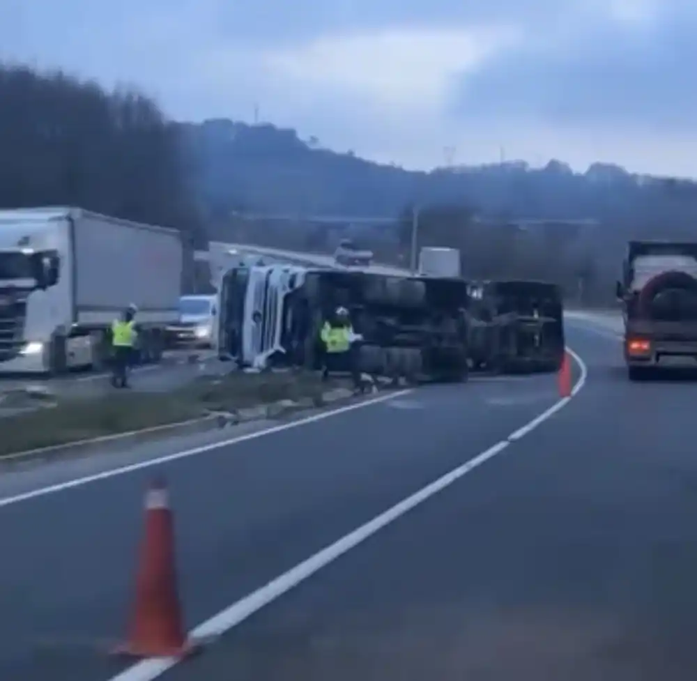 virajı alamayan çimento tankeri devrildi: 1 yaralı