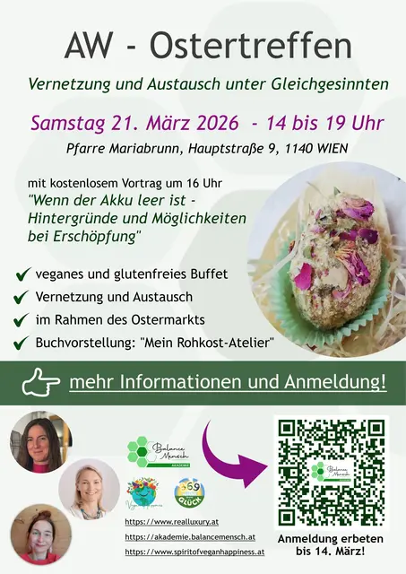 Am Samstag, dem 21. März 2026 von 14 bis 19 Uhr laden 3 Vereine (Balance Mensch Akademie, Verein Laetitia und Verein Spirit of Vegan Happiness) zu einem besonderen Treffen in Wien (Pfarre Mariabrunn) ein, bei dem ganzheitliche Gesundheit, Austausch und gemeinsames Erleben im Mittelpunkt stehen. Die Veranstaltung richtet sich an alle, die sich intensiver mit ihrem Körper auseinandersetzen und neue Impulse für mehr Gesundheit im Alltag erhalten möchten. Um Anmeldung wird erbeten! Ein zentraler...