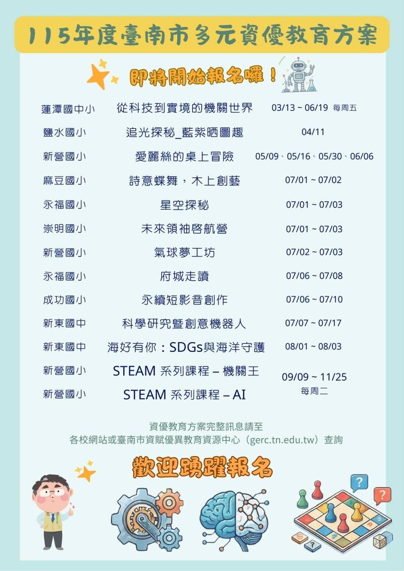 為深化資優教育發展,台南市推動「區域性多元資優教育方案」,整合各校師資專長與課程特色,規劃跨校、跨領域合作課程,讓不同學校的學生都有機會接觸多元學習內容。 在科技與創新應用方...…