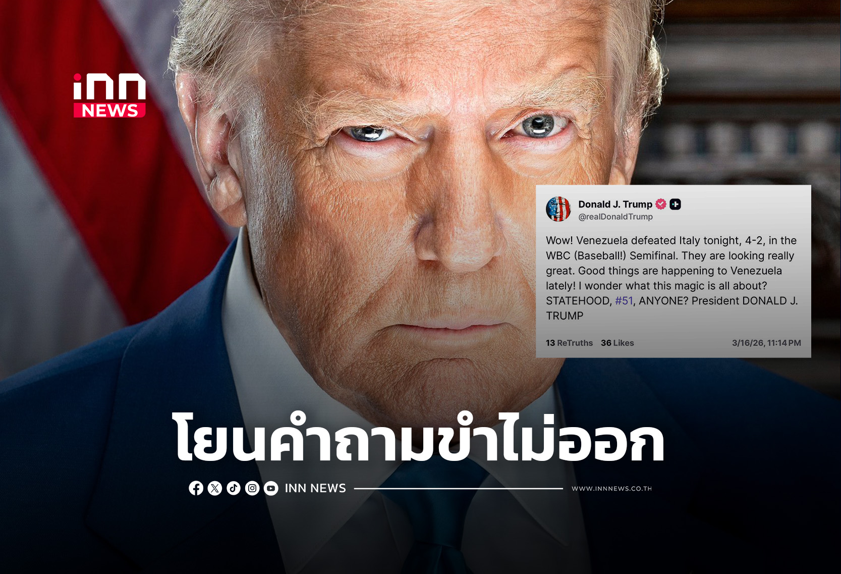 “โดนัลด์ ทรัมป์” จุดกระแส โยนคำถามหยอกล้อแต่แฝงนัยผนวก “เวเนซุเอลา” หลังทะลุชิง WBC ครั้งประวัติศาสตร์
