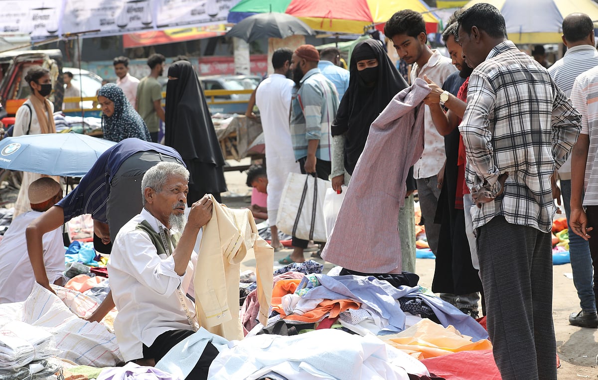 পবিত্র ঈদুল ফিতরের আগে কেনাকাটায় ব্যস্ত মানুষ। তুলনামূলক কম দামে পছন্দের পণ্য কিনতে নিম্ন আয়ের অনেকেই ভিড় করছেন ফুটপাত ও খোলা জায়গায় বসানো অস্থায়ী দোকানগুলোয়।