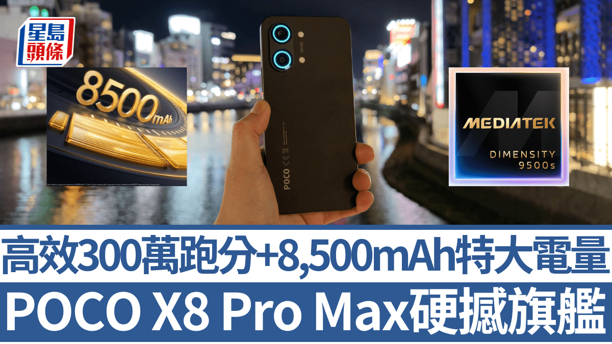 一向標榜高性價比的POCO再次發力,今回主角X8系列雖然定位中階,效能規格卻跟定價完全不成正比,甚至越級挑戰高階旗艦,其中X8 Pro Max率先採用Dimensity 9500s頂級處理器,《安兔兔》跑分直迫300萬大關,同時配備怪獸級8,500mAh大電量,性能及續航不輸價錢貴一倍的對手,對經常重度打機的用戶來說,這3千多元物有所值。 POCO X8 Pro Max高效跑分接近300萬8,50