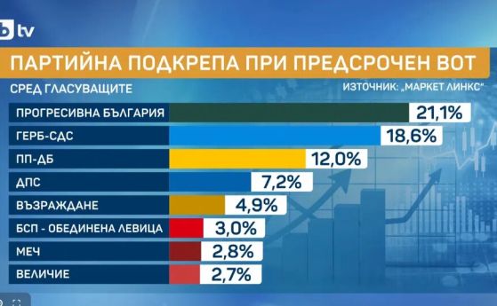 Коалицията на бившия президент Румен Радев "Прогресивна България" ще получава 21,1% на изборите, а ГЕРБ-СДС е с 18,6 на сто. Това сочи ново проучване на социологическата агенция "Маркет линкс" и бТВ, проведено между 7 и 15 март пометода пряко лично интервю и онлайн анкета. На трето място са ПП-ДБ с 12%. 4-процентовата бариера преминават още ДПС (7,2%) и „Възраждане“ (4,9%). Малко под прага за влизане в парламента остават БСП-ОЛ (3%), МЕЧ (2,8%), „Величие“ (2,7%). Социологът от „Маркет ЛИНКС“ До