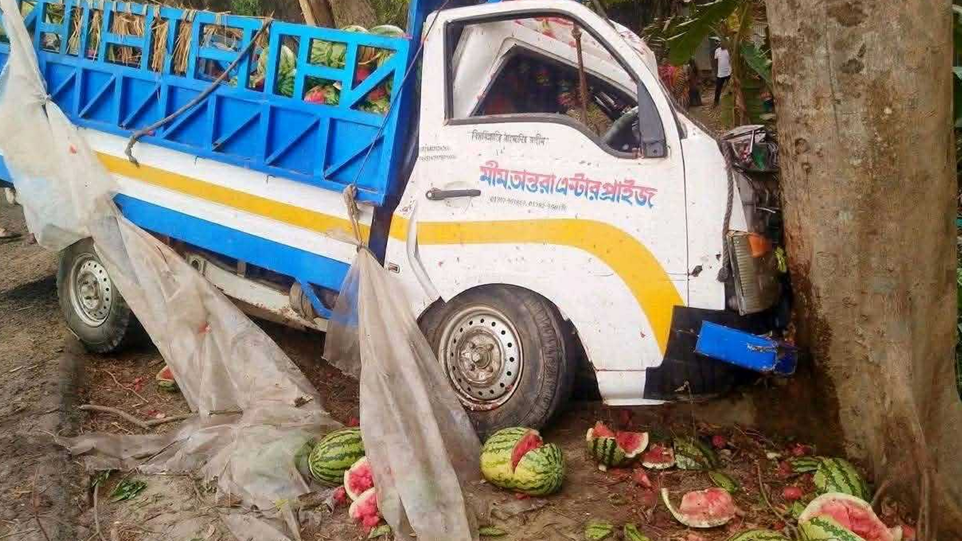 ফরিদপুরে তরমুজ বোঝাই একটি পিকআপ ভ্যান নিয়ন্ত্রণ হারিয়ে রাস্তার পাশে গাছের সঙ্গে ধাক্কা খেয়ে মোহাম্মদ ইউসুফ আলী শেখ নামে তরমুজ ব্যবসায়ী নিহত হয়েছেন। এ সময় গাড়িতে থাকা শতাধিক তরমুজ ছড়িয়ে-ছিটিয়ে পড়ে যায় এবং অধিকাংশ তরমুজ ফেটে নষ্ট হয়।বুধবার (১৮ মার্চ) ভোরে জেলা সদরের চন্ডিপুরে ঢাকা-খুলনা মহাসড়কে এই দুর্ঘটনা ঘটে। নিহত ইউসুফ আলী শেখ রাজবাড়ী জেলা সদরের খানখানাপুর নতুন বাজার এলাকার বাসিন্দা। এছাড়া এ ঘটনায় মোহাম্মদ আতিয়ার (৪২) নামে আরও একজন গুরুতর আহত হন। তাকে উদ্ধার করে ফরিদপুর মেডিকেল কলেজ হাসপাতালে ভর্তি করা হয়েছে। আরও পড়ুন: বগুড়ায় রোড ডিভাইডারে ধাক্কা লেগে মাইক্রোবাসে আগুন, ভাই-বোনসহ নিহত ৩ হাইওয়ে পুলিশ জানায়, পিকআপ ভ্যানটি ফরিদপুর থেকে রাজবাড়ীর খানখানাপুর যাওয়ার পথে নিয়ন্ত্রণ হারায় এবং রাস্তার পাশে থাকা একটি গাছের সঙ্গে ধাক্কা লাগে। এতে পিকআপের সামনের অংশ দুমড়ে-মুচড়ে যায় এবং ইউসুফ আলী শেখ ঘটনাস্থলেই মারা যান। দুর্ঘটনার সময় পিকআপে থাকা তরমুজ সড়কে ছড়িয়ে পড়ে। দুর্ঘটনার পর গাড়িচালক পালিয়ে গেছেন। করিমপুর হাইওয়ে থানার ভারপ্রাপ্ত কর্মকর্তা (ওসি) মো. সালাউদ্দিন চৌধুরী বলেন, পুলিশ দ্রুত ঘটনাস্থলে পৌঁছে পরিস্থিতি নিয়ন্ত্রণে এনেছে এবং যান চলাচল স্বাভাবিক রেখেছে। এ ঘটনায় আইনগত ব্যবস্থা নেয়া হচ্ছে।
