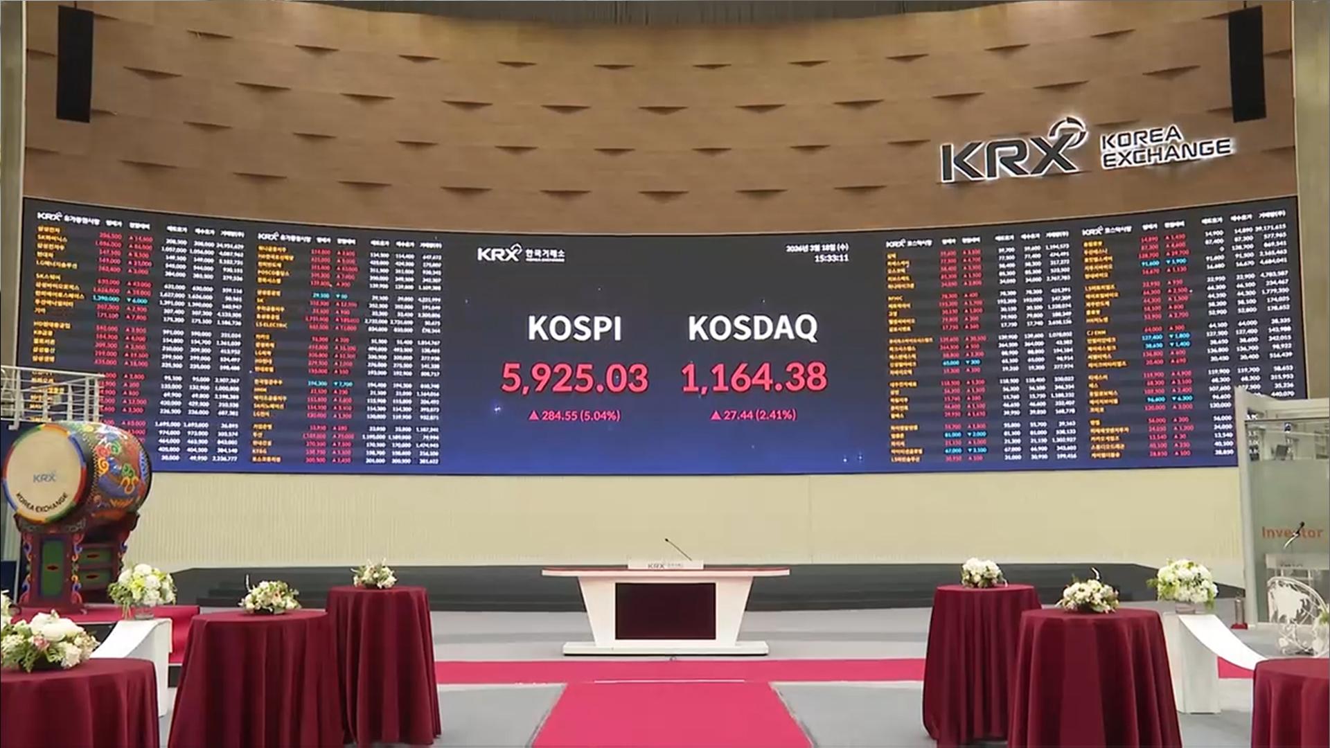 [앵커] 코스피가 사흘째 상승 흐름을 나타냈습니다. 매수세가 몰리며서 오후 장중 매수 사이드카가 발동되기도 했는데요. 반도체주 강세에 힘입어 5,900선을 넘어섰고, 삼성전자와 SK하이닉스가 각각 '20만전자', '100만닉스'를 회복했습니다. 자세한 마감 시황, 취재기자 연결해 알아봅니다. 김주영 기자. [기자] 네, 중동발 리스크가 이어지는 중에도 코스피는 사흘째 상승 마감했습니다. 오늘(18일) 코스피는 전날보다 5.04% 급등한 5...