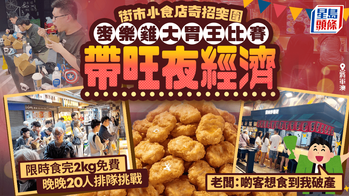 屋邨街市入夜後人流稀疏,淪為「死場」是不少地區普遍困局。然而,將軍澳景林街市一間小食店,最近憑藉一個「大胃王挑戰賽」,成功吸引大量人流,不僅為小店帶來人氣,更成功將原本入夜後趨於沉寂的街市食街,轉變為人聲鼎沸的美食熱點,活化街市「夜經濟」。 將軍澳「景林炒麵佬」麥樂雞大胃王比賽 帶旺屋邨街市夜經濟 15分鐘挑戰!2公斤麥樂雞、18件炸雞 「景林炒麵佬」於去年進駐景林街市,除了售賣售賣炸雞、薯條、燒