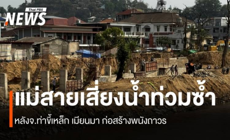 แม่น้ำสาย บ.ปางถุน จ.ท่าขี้เหล็ก ประเทศเมียนมา คนงานยังเร่งวางฐานรากและเร่งก่อกำแพงป้องกันน้ำท่วมความสูง 3 เมตร กว้าง 1 เมตร มีความยาวกว่า 433 เมตร บริเวณ บ.ปางถุน -สะพานมิตรภาพแห่งที่ 1 คาดว่าจะก่อสร้างแล้วเสร็จก่อนน้ำหน้าฝนปีนี้ ส่วนฝั่งตรงข้ามบริเวณหัวฝาย ชุมชนถ้ำผาจม-ตลาดสายลมจอย อ.แม่สาย จ.เชียงราย ที่กรมการทหารช่างได้ก่อสร้างพนังกึ่งถาวรบริเวณป้อมตำรวจ (หัวฝาย) ระยะทางยาวประมาณ 150 เมตร ซึ่งจุดนี้ปี 68 มีน้ำป่าพัดเสียหายต้องใกล้กล่องหินเกเบี้ยนป้องกันชั่วคราว และมีถุงบิ๊กแบ็คใส่กระสอบทรายเป็นแนวป้องกัน ชาวบ้านชุมชนถ้ำผาจม อ.แม่สาย ได้เปิดเผยถึงความกังวลหลังฝั่ง จ.ท่าขี้เหล็กประเทศเมียนมา ได้ก่อสร้างพนังซึ่งดูด้วยตามีความมั่นคงแข็งแรง สภาพพนังปัจจุบันในฝั่งแม่สาย ที่บางส่วนเป็นกระสอบทรายน่าจะไม่สามารถป้องกันน้ำท่วมได้ ตัวเองเพิ่งซ่อมบ้านและเข้าอาศัยสภาพควาเสียหายน้ำท่วมใหญ่ปี 2567 ยังเห็นรอบหมู่บ้าน ตัวเองคิดว่าน้ำหลากปีนี้ ไม่รู้น้ำจะมามากแค่ไหน แต่พนังที่มีอยู่หลังฝั่งเมียนมาสร้างเสร็จ มีความแข็งแรงกว่า ช่วงฤดูฝนคงอพยพไปอยู่บ้านญาติก่อน เช่นเดียวกับชาวบ้านอีกคนบริเวณชุมชนถ้ำผาจม บอกว่าแนวป้องกันน้ำท่วมที่กรมการหารช่างมาทำไว้ชั่วคราว ตอนนี้แทบไม่เหลือสภาพแนวป้องกันน้ำท่วมปีที่แล้ว ชาวบ้านได้ประชุมหมู่บ้านถึงแนวทางป้องกันน้ำท่วม ก็ยังไม่มีหน่วยงานไหนจะสร้างความมั่นใจป้องกันน้ำท่วม โดยเฉพาะก่อสร้างพนัง ทีมข่าวไทยพีบีเอส ได้ไปสำรวจแนวกำแพงป้องกันน้ำท่วมที่กรมการทหารช่างก่อสร้างชั่วคราวและกึ่งถาวร พบว่าบางจุดมีเพียงกระสอบทรายถุงบิ๊กแบ็กเป็นแนวป้องกันน้ำท่วม ปี 2568 ซึ่งมีสภาพเปื่อย ผุสลาย และเสี่ยงที่จะถูกกระแสน้ำพัดและป้องกันน้ำท่วมไม่ได้ ด้านประธานสภาเทศบาลตำบลเวียงพางคำ อ.แม่สาย จ.เชียงราย เปิดเผยว่าที่ผ่านมาได้มีการประชุมชาวบ้านและหน่วยงานที่เกี่ยวข้องถึงแผนป้องกันน้ำท่วมแม่สาย แต่ปัญหาใหญ่ตอนนี้ท้องถิ่นและส่วนกลางมีงบประมาณไม่เพียงพอ ทำให้เมืองแม่สายเสี่ยงที่จะถูกน้ำท่วมหนักปีนี้ ตอนนี้ต้องรองบประมาณภาครัฐ ส่วนท้องถิ่นมีงบประมาณไม่เพียงพอ ที่ทำไว้ชั่วคราวบิ๊กแบกตอนนี้สภาพเปื่อยหมดแล้ว ถ้าไม่ทำพนังแม่สายจะถูกน้ำท่วม ซึ่งทางเมียนมาทำพนังถาวรสูง 3 เมตร กว้าง 1 เมตร ฝั่งเรายังไม่ทำอะไรเลย ด้าน ผศ.ณัฐพล รังสฤษฎ์วรการ รักษาการแทน ผู้ช่วย ผอ.ศูนย์บริการวิชาการ ม.แม่ฟ้าหลวง กล่าวว่า หลังการก่อสร้างพนังป้องกันน้ำท่วมบริเวณแม่น้ำสายในฝั่งเมียนมา-ไทย