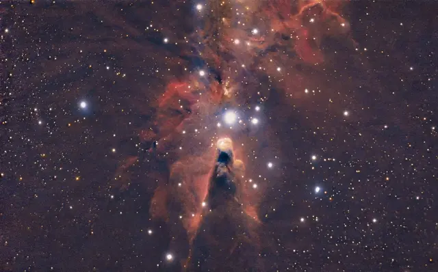 Eine riesige Berglandschaft erstreckt sich hier vor uns. Im Himmel. Das Sternbild Einhorn ist nicht gerade mit hellen Sternen gesegnet. Es befindet sich östlich vom Sternbild Orion. Es ist aber mit vielen Nebelgebieten gespickt, alle noch Teil des Orion Molekülwolkenkomplexes. Genau wie die Berge auf der Erde werden diese Wolken gebildet und zerfallen wieder. Über 100te Millionen Jahre. Diese kosmischen Wolken bestehen aus Gas und Staub. Auffällig an diesem Nebel ist der säulenartige Komplex...