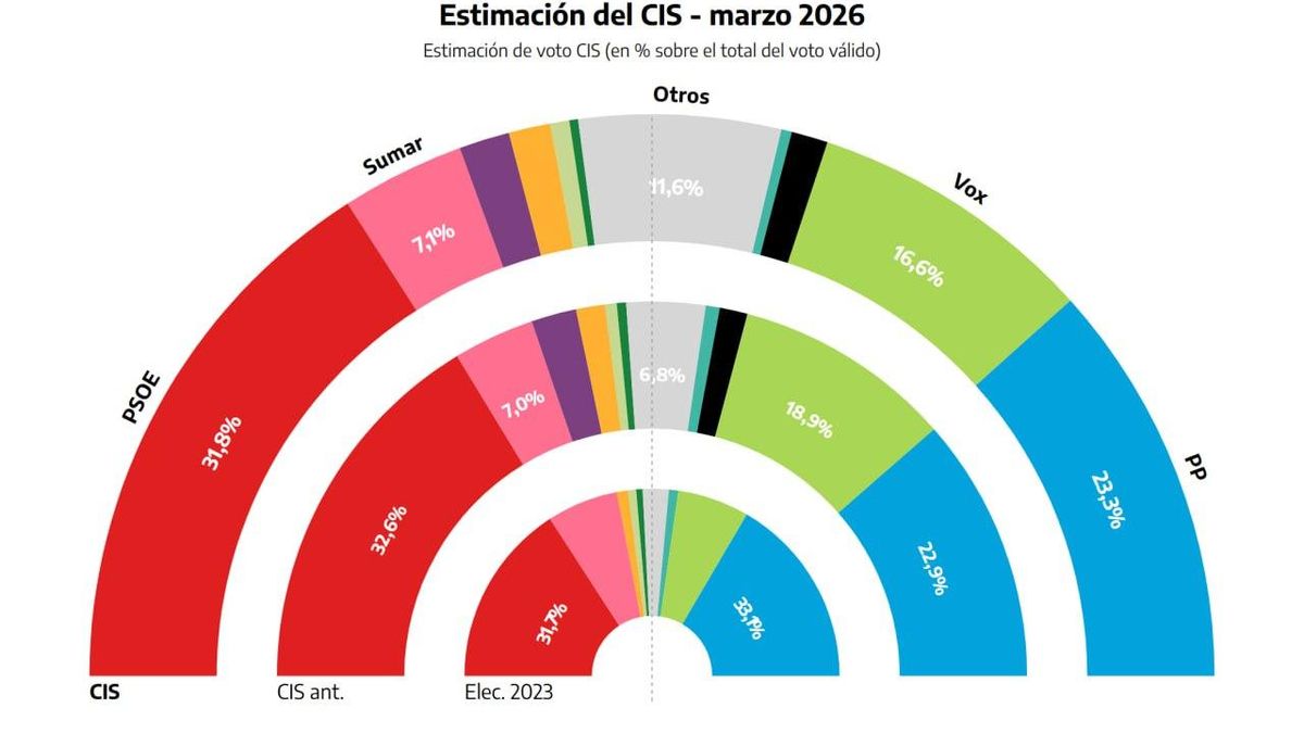 Los socialistas logran un 31,8% de los votos, el PP, un 23,3%, Vox, un 16,6%, Sumar, un 7,1%, y Podemos, el 2,9%, según el barómetro de marzo del instituto que dirige José Félix Tezanos El anterior barómetro - Se amplía a casi diez puntos la ventaja del PSOE sobre el PP mientras Vox crece y Sumar cae Estimación del CIS - marzo 2026 Estimación de voto CIS (en % sobre el total del voto válido) El PSOE de Pedro Sánchez vuelve a ser el partido con más respaldo entre los españoles, según el Centro de Investigaciones Sociológicas (CIS). Pero el Barómetro de marzo, hecho público este miércoles, reduce su ventaja sobre el PP, respecto a febrero, cuando le sacaba 10 puntos. Así, en el caso de que se celebraran ahora las elecciones generales, los socialistas lograrían el 31,8% de los votos, casi un punto menos que el mes pasado cuando logró un 32,6%. La ventaja respecto a los populares es ahora, por tanto de 8,5 puntos. El PP crece cuatro décimas y pasa del 22,9% de enero al 23,3% actual y Vox reduce considerablemente su apoyo en casi dos puntos y pasa del 18,9% de enero al 16,6% de febrero, con lo que se queda a solo cuatro puntos de los populares. Sumar crece una décima, hasta el 7,1% y Podemos baja un punto, hasta el 2,9%. Vox es la fuerza política que más cae según este sondeo. Las encuestas de este último barómetro se hicieron entre el 2 y el 6 de marzo y, por tanto, una vez que comenzaron los ataques de Israel y EEUU a Irán o Líbano, y tras quedar claro el rechazo de España a esas intervenciones militares con el 'no a la guerra' agitado por el presidente del Gobierno, Pedro Sánchez. Además, el trabajo se realizó en plena campaña electoral de las elecciones en Castilla y León del domingo en las que ganó el PP de Alfonso Fernández Mañueco, pero en las que también resistió el PSOE, que obtuvo dos escaños más que en 2022. Esos comicios confirmaron la dependencia entre PP y Vox y el hundimiento de la izquierda confederal.