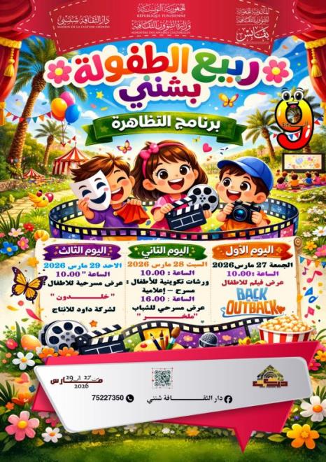 تنظم، دار الثقافة شنني، فعاليات الدورة التاسعة لتظاهرة ربيع الطفولة بشنني، وذلك من 27 الى 29 مارس 2026. ويتضمن برنامج التظاهرة التي تنتظم باشراف، المندوبية الجهـوية للشؤون الثقافية بقابس، عروضا سينمائية ومسرحية وورشات تكوينية في المسرح والاعلامية. وسيكون الاطفال، على موعد يوم الجمعة 27 مارس