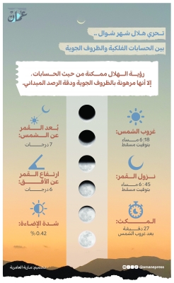أفادت الحسابات الفلكية الخاصة بهلال شهر شوال لعام 1447هـ بأن ولادة الهلال ستحدث غدًا الخميس الموافق 19 مارس 2026م، وذلك وفق ما أوضحه يوسف بن حمد الرحبي مدير دائرة الشؤون الفلكية بو...