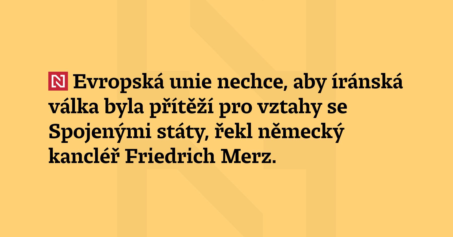 Evropská unie nechce, aby íránská válka byla přítěží pro vztahy se Spojenými státy, řekl německý kancléř Friedrich Merz. Evropská unie se ale podle něj nesmí bát vyjádřit odlišný postoj. (ČTK)