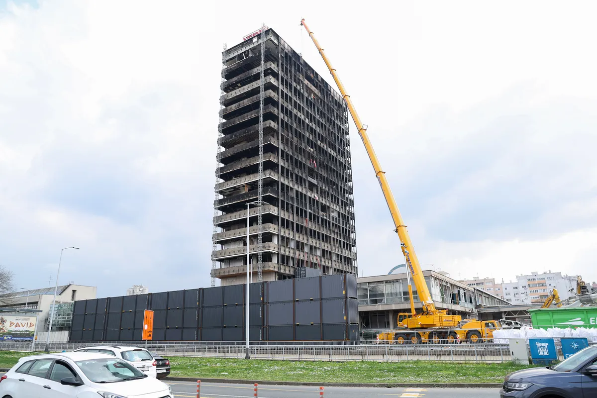 Golema dizalica stigla je nedavno pred zgradu Vjesnika, koji je u postupku rušenja, a priprema se i uklanjanje natpisa Vjesnik, koji vrh zgrade krasi