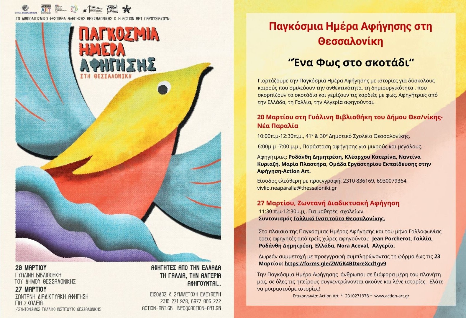 Ο Δήμος Θεσσαλονίκης, το Διαπολιτισμικό Φεστιβάλ Αφήγησης Θεσσαλονίκης και η Action Art γιορτάζουν την Παγκόσμια Ημέρα Αφήγησης με ένα πλούσιο πρόγραμμα εκδηλώσεων που φωτίζουν τις καρδιές μικρών και μεγάλων μέσα από τη δύναμη των ιστοριών. Με κεντρικό θέμα «Ένα φως στο σκοτάδι», η φετινή διοργάνωση εστιάζει σε αφηγήσεις που αναδεικνύουν την ανθεκτικότητα, τη δημιουργικότητα και την ... Περισσότερα www.ertnews.gr