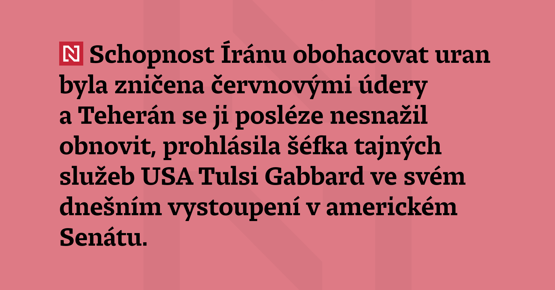 Schopnost Íránu obohacovat uran byla zničena červnovými údery a Teherán se ji posléze nesnažil obnovit, prohlásila šéfka tajných služeb USA Tulsi Gabbard ve svém dnešním vystoupení v americkém Senátu. Nebezpečím, že Írán získá jadernou zbraň, zdůvodnily Izrael i Spojené státy letošní údery na tuto zemi. (ČTK)
