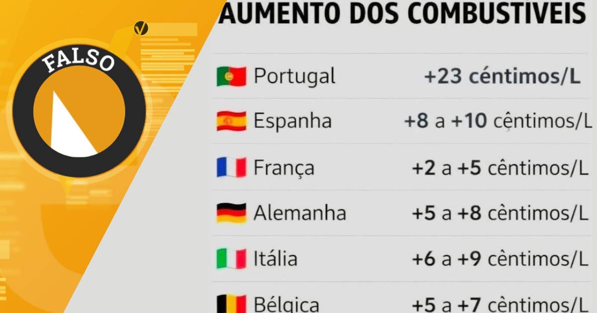 Nas redes sociais está a circular uma tabela com os alegados aumentos dos preços dos combustíveis em Portugal, Espanha, França, Alemanha, Itália e Bélgica. Alega-se que em terras lusas o aumento foi de 23 cêntimos por litro, mas noutros países a subida foi muito inferior (entre dois e 10 cêntimos). A SIC Verifica.