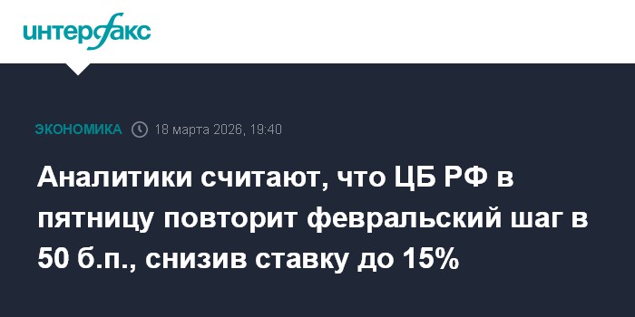 Аналитики считают, что ЦБ РФ в пятницу повторит февральский шаг в 50 б.п., снизив ставку до 15%