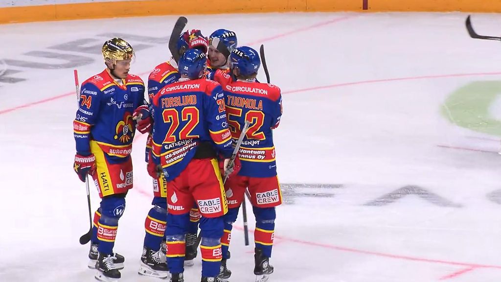 Jokerit tylytti Kiekko-Vantaata kolmannen Mestis-välierän avauserässä 4–0. Jokerit-kultakypärä Alexander Forslund oli syöttämässä jokaista periodin maalia.