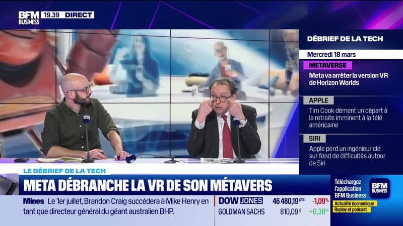 Ce mercredi 18 mars, François Sorel a reçu Clément David, président de Theodo Cloud, Jean Schmitt, président de Jolt Capital, et Jérôme Colombain, journaliste et créateur du podcast « Monde Numérique ». Ils se sont penchés sur Meta arrêtant la version VR d'Horizon Worlds de son métavers, Tim Cook démentant un départ à la retraite imminent chez Apple devant la télé américaine, ainsi que la perte d'un ingénieur clé sur fond de difficultés autour de Siri chez Apple, dans l'émission Tech & Co, la quotidienne, sur BFM Business. Retrouvez l'émission du lundi au jeudi et réécoutez-la en podcast.