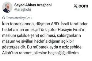 وزیر امور خارجه جمهوری اسلامی ایران، شهادت شهروند ترکیه در جریان حمله آمریکایی ـ صهیونیستی به ایران را تسلیت گفت. به گزارش ایلنا، سید عباس عراقچی در این زمینه در شبکه اجتماعی ایکس نوشت: «شهادت مظلومانه آقای حسین فیرات راننده زحمتکش ترکیه ای که در خاک جمهوری اسلامی ایران مورد اصابت دشمن آمریکایی اسراییلی قرار گرفت گواه روشنی از هدف گیری مردم بیگناه و غیر نظامی از سوی نیروهای متجاوز است.» وزیر امور خارجه جمهوری اسلامی ایران افزود: «به بازماندگان ایشان تسلیت می گویم و برای آن شهید عزیز در این ماه مبارک، رحمت بیکران الهی مسئلت دارم.»