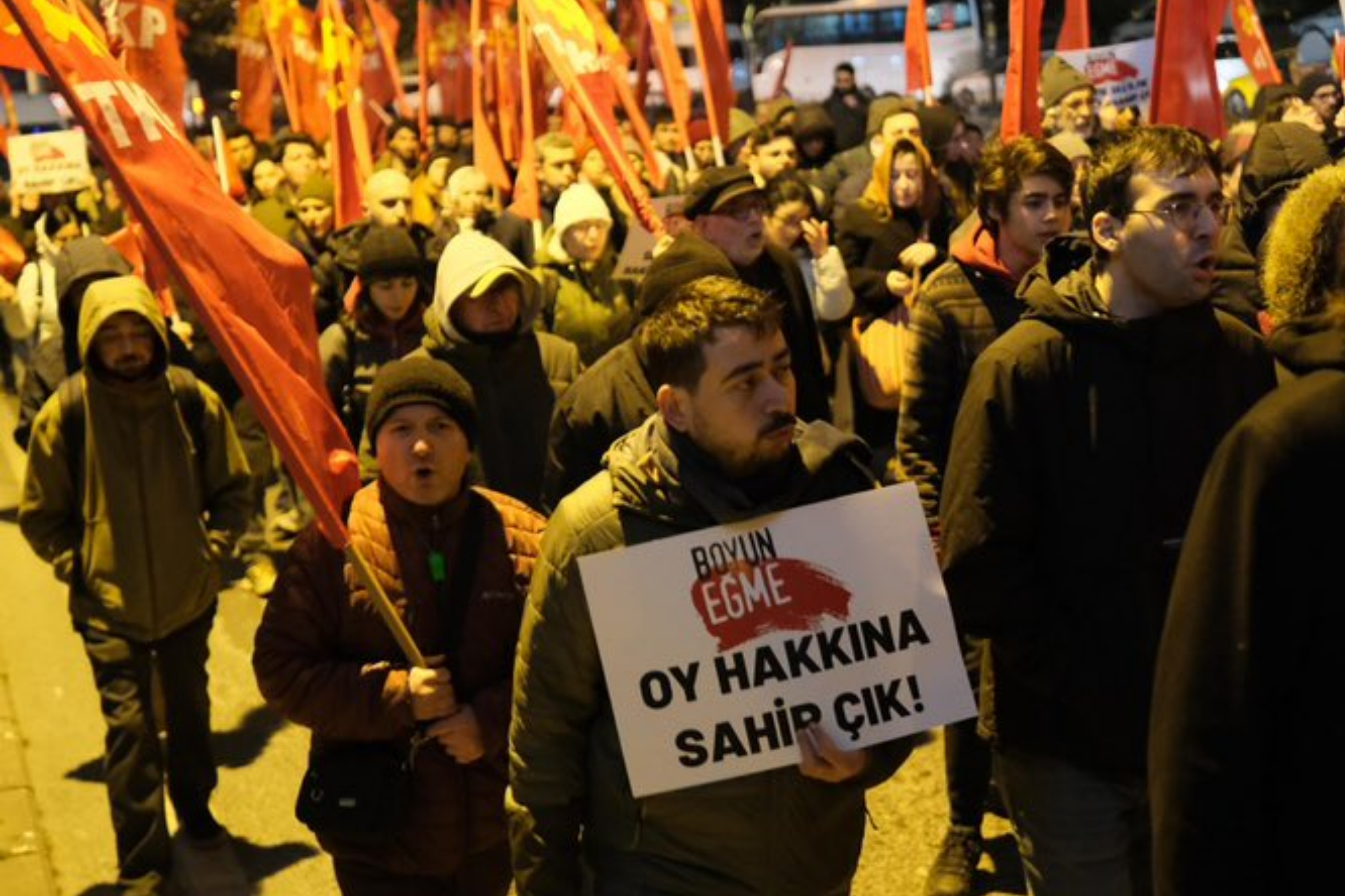 İstanbul Büyükşehir Belediye (İBB) Başkanı Ekrem İmamoğlu ve çok sayıda belediye başkanının gözaltına alınıp sonrasında tutuklandığı 19 Mart operasyonların üzerinden bir yıl geçti. 19 Mart’ın 1. yılında İBB Başkanlığı’nın bulunduğu Saraçhane’de “Millet İradesine Sahip Çıkıyor” mitinglerinin 99’uncusunu düzenleniyor. AKP zorbalığına karşı Saraçhane'de başlatılan eylemlerin birinci yılında CHP başta olmak üzere siyasi partiler, sendikalar, emek meslek örgütü temsilcileri bir araya geldi. Öğrenciler Beyazıt'tan Saraçhane'ye yürüdü Üniversite öğrencileri Beyazıt'ta toplandı, geçen yıl barikatın aşıldığı yerden geçerek Saraçhane'ye yürüdü. Meydanda yapılan açıklamada baskıların son bulması istendi, “Başta Ekrem İmamoğlu olmak üzere tüm siyasi tutsaklar serbest bırakılsın. KYK burslarına enflasyon oranında zam yapılsın. Tüm krediler bursa dönüştürülsün ve ihtiyacı olan her öğrenciye burs verilsin. Çocuk işçilik yasaklansın. Genç işçiliği güvenceli hale getirilsin. NATO’dan çıkılsın! Bütçe savaşa değil eğitime harcansın.” talepleri sıralandı. TKP: Boyun eğme memlekete sahip çık Türkiye Komünist Partisi (TKP), “AKP'nin seçme ve seçilme hakkına saldırılarına karşı Saraçhane'ye yürüyoruz. Boyun eğme memlekete sahip çık!” diyerek Saraçhane’ye yürüdü. “Oy hakkına sahip çık” pankartları taşınırken, “Bu halk size diz çökmez, boyun eğmez” sloganları atıldı. AKP'nin seçme ve seçilme hakkına saldırılarına karşı Saraçhane'ye yürüyoruz. Boyun eğme memlekete sahip çık! pic.twitter.com/C1jqXBu4qR — TKP - İstanbul (@istanbul_tkp) March 18, 2026 TKP İstanbul İl Başkanı Ahmet Dincel, yürüyüşün ardından konuşma yaptı. Dincel, “Bu topraklarda yüz küsür yıl önce yapamadığınızı tamamlatmayacağız size. Bu topraklara rotasını çevirecek olanlara, bu ülkede o emperyalist rotalara zemin hazırlayanlara buradan sesleniyoruz. Karşınıza dikiliriz. Bu topraklar sizin deneme tahtanız değil” dedi. Mücadeleyi yükselteceklerini belirtti ve “25 yıldır Erdoğan'ın uykularını kaçıran tek şey Türkiye'de örgütlü halkın mücadelesidir” ifadelerini kullandı. Açıklamanın tamamı şöyle: “AKP'nin karanlığına zulmüne boyun eğmeyenler ayağa kalkanlar hoş geldiniz. Bundan tam bir yıl önce halkın siyaset yapma hakkına çok büyük bir saldırıyla karşı karşıya kaldık. Halkın egemenlik gücüne, cumhuriyetin kazanımlarına çok büyük bir saldırıyla, halkın siyaset yapma hakkını ayaklar altına alma saldırısıyla karşı karşıya kaldık. Bir yıl önce emekçilerle halkımızla beraber bu saldırıya karşı ayağa kalktık. O hafızayı yok etmemek için, o hafızanın, o ayağa kalkışın arkasında durmak için bugün yine buradayız. Ayağa kalkmaya devam ediyoruz. Elimizden almaya çalıştıkları sıradan bir şey değil. Elimizden almaya çalıştıkları için bundan yüz küsur yıl önce Anadolu halkı canı pahasına mücadele etti. Seçme ve seçilme hakkı, siyaset yapma hakkı, Anadolu halkının emperyalizme karşı ayağa kalkmasıyla kazanıldı. O hakkı size yedirtmeyiz. Peki bu yeter mi? Yetmez. Buradan ABD haydutluğuyla ortaklık kuranlara da bir çift sözümüz var. Bu toprakları emperyalistlerle bir olup sizin deneme tahtası yapmanıza izin vermeyeceğiz. Bu topraklarda yüz küsür yıl önce yapamadığınızı tamamlatmayacağız size. Bu topraklara rotasını çevirecek olanlara, bu ülkede o emperyalist rotalara zemin hazırlayanlara buradan sesleniyoruz. Karşınıza dikiliriz. Bu topraklar sizin deneme tahtanız değil. Söyleyeceğiz. Sesimizi kimsenin kısmasına izin vermeyiz. Bir yanda kayyımlar, tarikatlar, holdingler, böyle bizim sesimizi kısmaya çalışan kolluk kuvvetleri var ama bir yanda ayağa kalkan emekçi halklar var. Yoksulluk, hayat pahalılığı, işsizlik, mobbing, adaletsizlik, liste çok uzun. Bu listeye verilecek cevabı, büyütülecek kuvveti çok iyi biliyoruz. Bunların tek bir çözümü var. Örgütlü halkın kuvvetini yükseltmek, örgütlü halkın kuvvetini büyütmek. 25 yıldır Erdoğan'ın uykularını kaçıran tek şey Türkiye'de örgütlü halkın mücadelesidir. O mücadeleyi yükselteceğiz. Memleketimize sahip çıkmaya devam edeceğiz. Emekçi halkın kanı pahasına, canı pahasına kazandıklarından bir adım bile geri atmayız. Daha fazlasını alacağız. Bu ülkeden emperyalistleri onların işbirlikçilerini yeni Osmanlı meraklılarını göndereceğiz.” Özel: Turbun büyüğü belli, turbun küçüğü 1.50 Ekrem İmamoğlu gönderdiği mektupta "Zalimin zulmü varsa, bizim de aslan gibi yüreğimiz, dağ gibi dimdik, eğilmez başımız, seçimlerde bükemedikleri bileğimiz var. Demokrasinin ve aydınlık geleceğimizin önüne dikilmek istenen tüm barikatları yıkıp geçen, ateş gibi gençlerimiz var" ifadelerini kullandı. Ardından kürsüde yerini alan Özgür Özel "Biz gücümüzü okyanusun ötesinden almıyoruz. Biz gücümüzü Trump'tan almıyoruz. Biz gücümüzü bu meydandan, bu meydanın mücadele azminden alıyoruz" dedi. Özel şunları söyledi: “ Sevgili İstanbullular, küçük turpun dün bir basın toplantısı yaptık ve küçük turpun marifetlerini anlatmaya başladık. İzlediniz mi? Büyük turpu biliyor musunuz? Turpun büyüğü belli, küçüğü 1,50. Onu da biliyor musunuz? İşte o her darbede, her kumpasta aparat olanlar kısa süreli de olsa bazen menfaat elde edebilirler. Makam ve mevki elde edebilirler. Ama milletin vicdanı bunları unutmaz. Gerçekler teker teker ortaya çıkar. 19 yıl devlet memurluğu yapmış; en yüksek maaştan ömür boyunca bir kibrit kutusu bile almamış, bir bardak su bile içmemiş olsa bütün maaşlarına biriktirse 45 milyon lira edecek birisinin üzerinden 452 milyon 