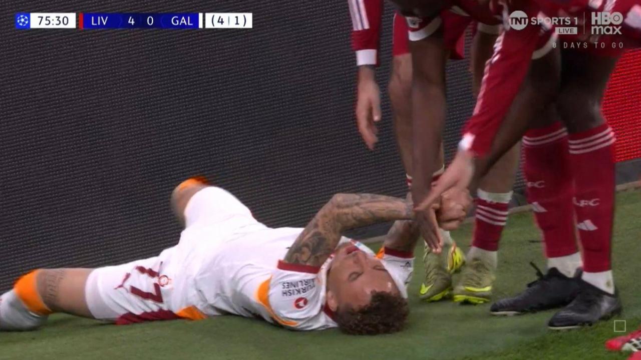 Liverpool-Galatasaray, paura per Lang: si fa male ad una mano sbattendo sui pannelli pubblicitari. Esce in barella | FOTO