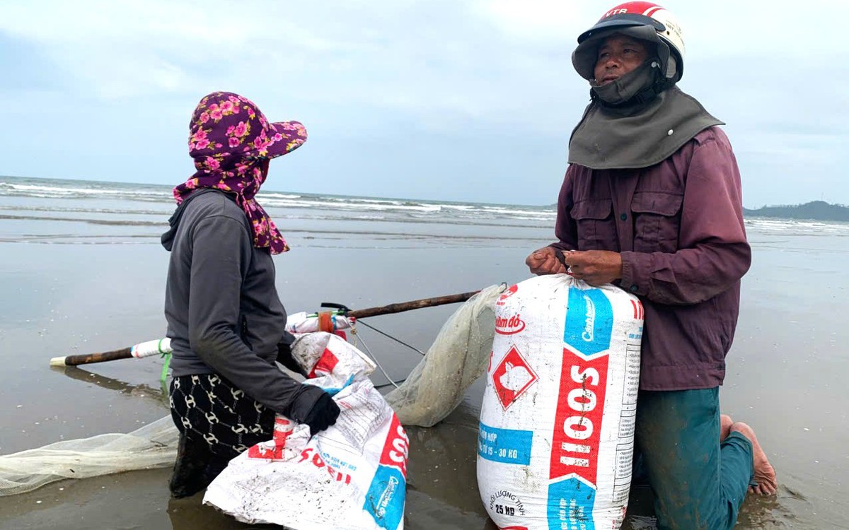 Chỉ cần một loại dụng cụ khá đơn giản, người dân lội nước đi giật lùi dọc bờ biển cũng có thể kiếm tiền triệu mỗi ngày bằng nghề khai thác ốc tép.
