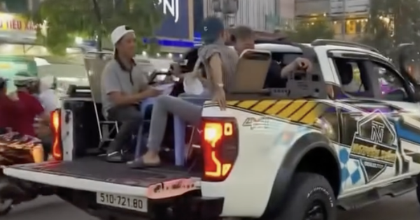 (NLĐO) - Nhóm thanh niên bày bán bàn ghế, ăn uống trên thùng xe tải khi xe đang lưu thông trên đường.