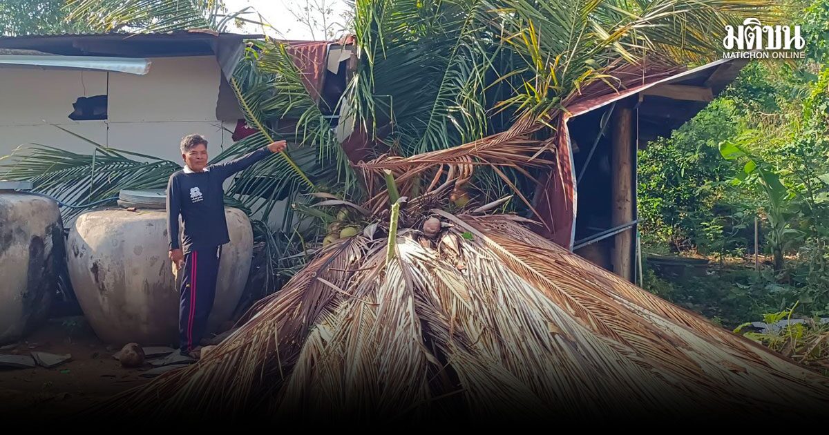 ชัยภูมิระทึก พายุฤดูร้อนถล่ม พัดหลังคาปลิวว่อน ต้นมะพร้าวล้มทับบ้าน 3 ชีวิตนั่งกินข้าวหวิดดับ