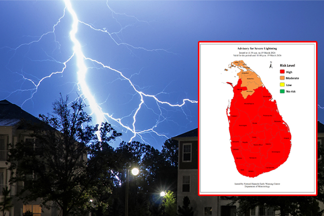 බස්නාහිර, සබරගමුව, මධ්යම, උතුරු මැද, දකුණ, ඌව, වයඹ සහ නැගෙනහිර පළාත්වලත් මන්නාරම දිස්ත්රික්කයේත් ඇතැම් ප්රදේශ වල සවස 2.00 න් පමණ පසුව ගිගුරුම් සහිත වැසි සමග ප්රබල අකුණු ඇතිවීමේ වැඩි හැකියාවක් පවතින බව කාලගුණවිද්යා දෙපාර්තමේන්තුව පවසයි.