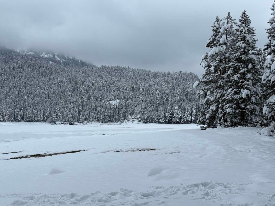 Crno jezero i šuma prekriveni su bijelim prekrivačem