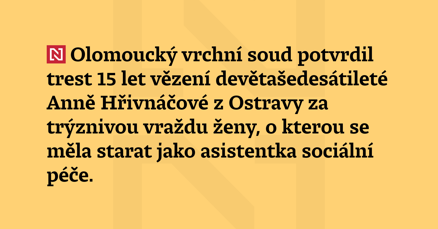 Olomoucký vrchní soud potvrdil trest 15 let vězení devětašedesátileté Anně Hřivnáčové z Ostravy za trýznivou vraždu ženy, o kterou se měla starat jako asistentka sociální péče. Podle rozsudku dlouhodobě a úmyslně zanedbávala péči o svou stejně starou spolubydlící, profitovala přitom ze sociálního příspěvku na péči. Nemohoucí žena zemřela v březnu 2024, podle odborníků trpěla mimo jiné dlouhodobou podvýživou. Žena popírala, že […]