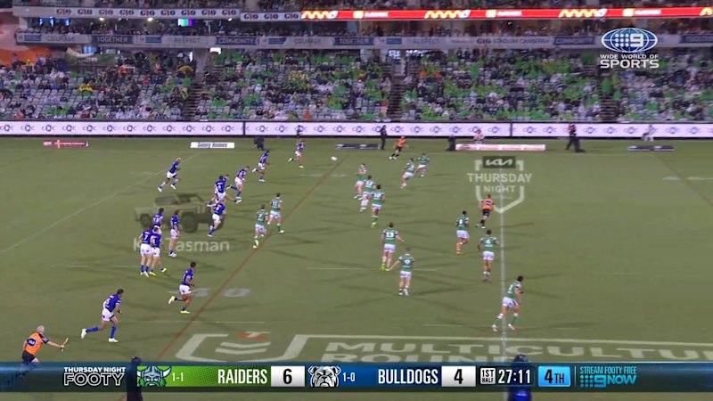 Bulldogs five-eighth Matt Burton nails a 40/20 against the Raiders.