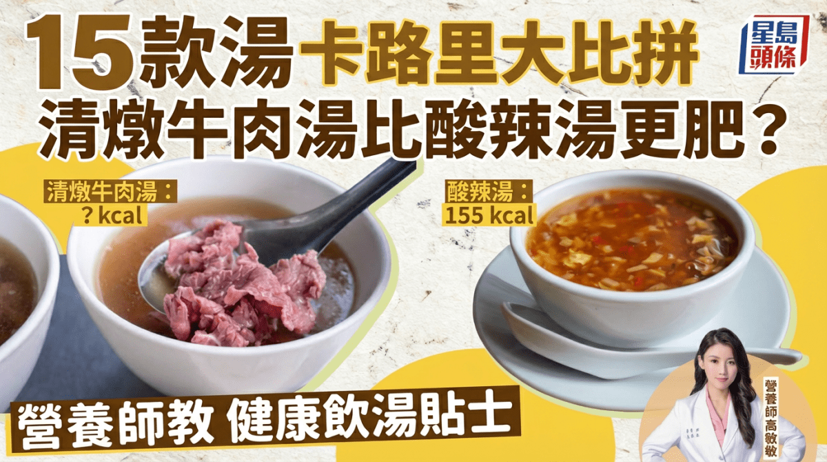 不少人吃飯都喜歡喝一碗熱湯,看似清淡的湯品未必健康低卡,小心隨時墮入致肥陷阱!有營養師列出15款常見湯品的卡路里,其中清燉牛肉湯熱量竟然比酸辣湯更高。她也教4大健康飲湯貼士,加入3食材更可減緩血糖上升。 15款湯卡路里大比拼 清燉牛肉湯竟比酸辣湯更肥? 營養師高敏敏在Facebook專頁發文列出15款常見湯品的熱量排行榜,大家可作參考: 15款湯卡路里大比拼 (約1人份量計算): 1.麻油雞湯 熱