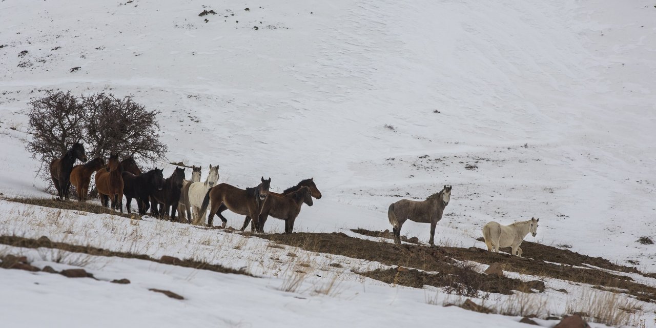 Malatya ile Sivas illeri arasında yer alan Yama Dağı’nın kuzey kesimlerinde yaşayan yılkı atları, karla kaplı arazide zorlu kış şartlarına rağmen yaşamlarını sürdürüyor.