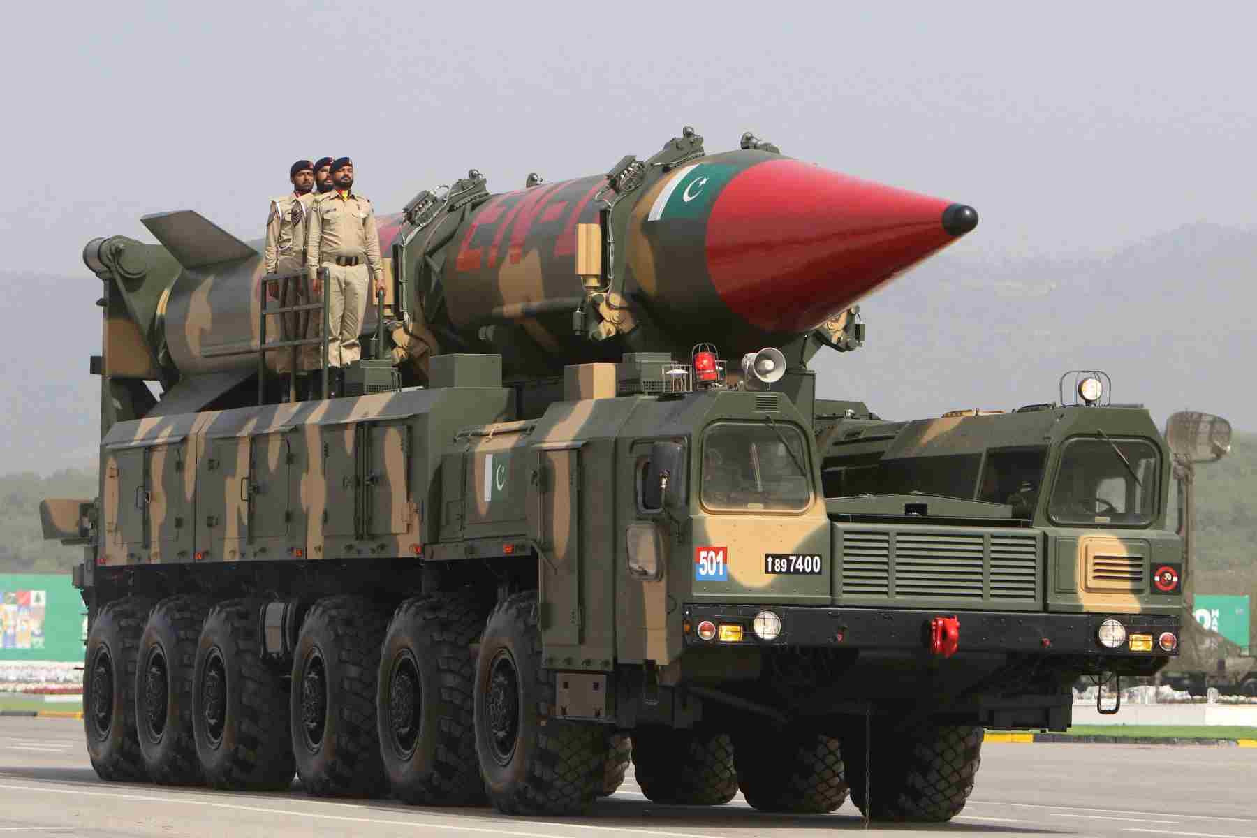23 مارچ، 2023 کو اسلام آباد میں پاکستان کے یوم دفاع کے موقعے پر بیلسٹک میزائل شاہین کی نمائش کی جا رہی ہے (اے ایف پی)