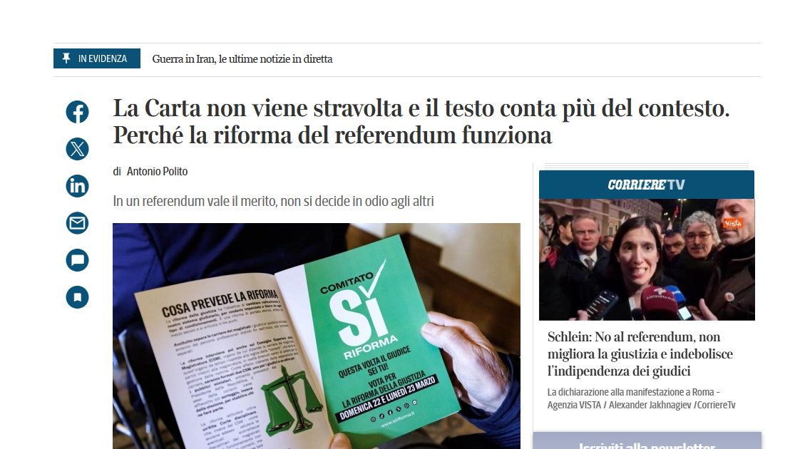 di Giuseppe Criaco Mercoledì il Corriere della Sera in una operazione “di supporto istituzionale” offre a questo governo una delle sue penne migliori (Antonio Polito) per spiegare ai lettori moderati del suo giornale perché è giusto votare Sì! Nell’attesa di leggere analogo e autorevole contributo per il No!, in punta di piedi vi spiego perché […] L'articolo Dice Polito che la riforma Nordio giova al Paese. E in cosa mi chiedo? proviene da Il Fatto Quotidiano .