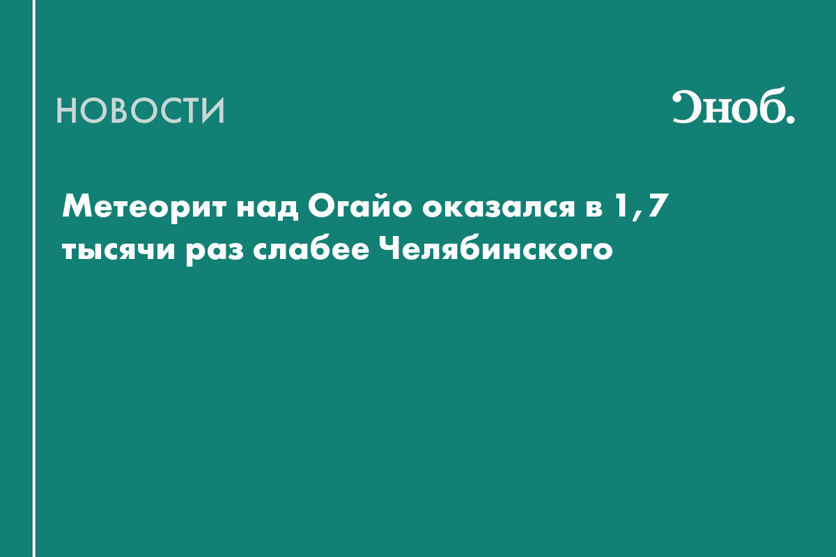 Энергия метеорита, взорвавшегося в небе над американским штатом Огайо, оказалась примерно в 1,7 тысячи раз меньше, чем у Челябинского метеорита, упавшего в России в феврале 2013 года. Об этом ТАСС рассказал научный сотрудник Института геохимии и аналитической химии (ГЕОХИ) имени В. И. Вернадского РАН Константин Рязанцев.