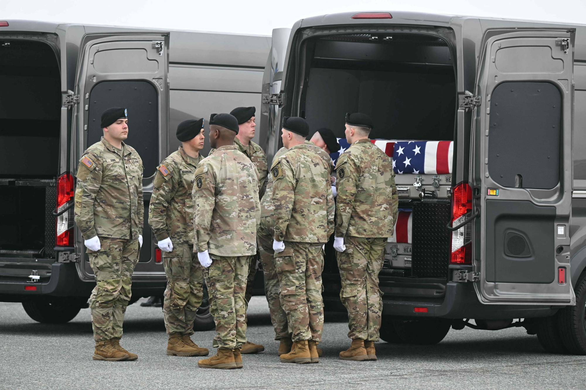 Delaware’de düzenlenen resmi bir tören sırasında, ABD askerlerinden oluşan bir ekip, askerlerin naaşlarını taşıyan bayraklarla örtülü tabutların önünde duruyor. (AFP)