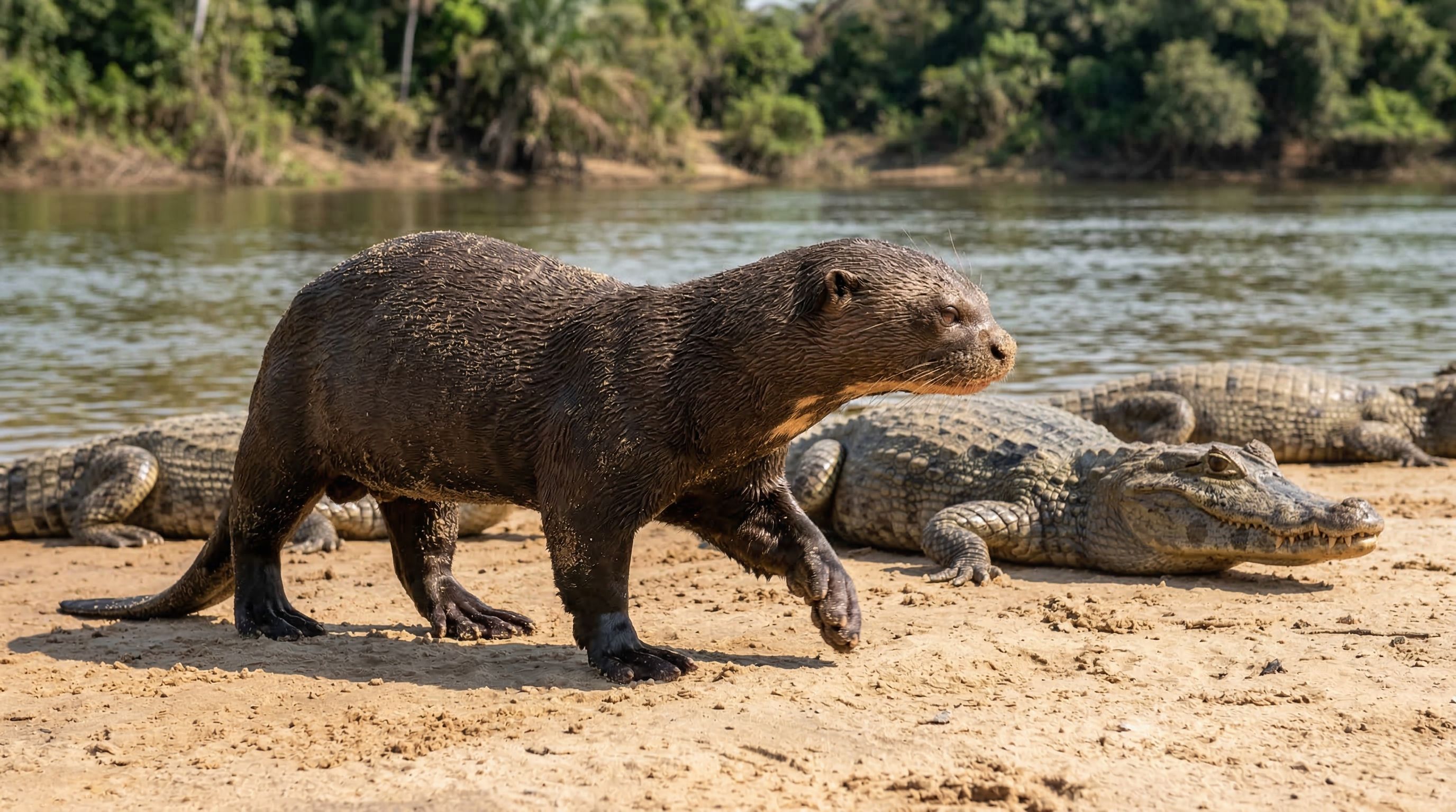 Lontra gigante ri na cara do perigo e rola na areia diante de vários jacarés
