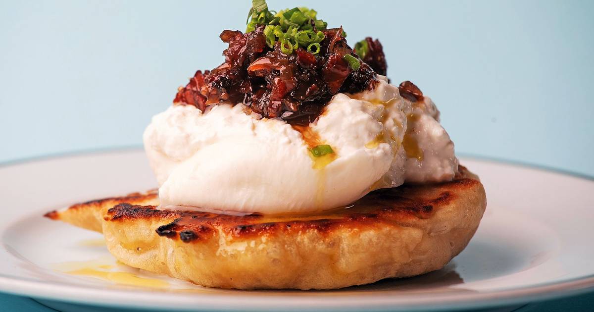 Experimente esta deliciosa receita de pão frito, burrata e compota de cebola e chouriço
