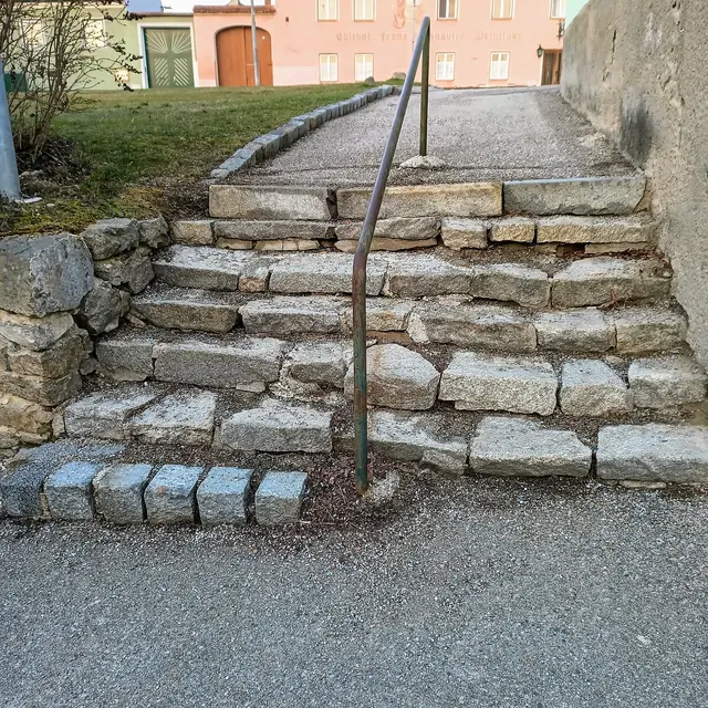 Über 7 Stufen musste man gehn um vom Kaufhaus Halbwidl zum Milchhaus oder zum Gasthaus "Zum roten Ochsen" zu gelangen. Tausende Male wurde diese Stiege von Jung und Alt benutzt. Sei es zum Einkaufen oder Milch holen. Viele Wirtshausbesucher wankten nach hitzigen Diskussionen abends oder nach dem sonntäglichen Frühschoppen heimwärts. Der Zahn der Zeit hat auch hier seine Spuren hinterlassen. Lose Steine erinnern jetzt eher an eine schlampige Trockenstein-Ausführung, deren Benutzung vorallem im...