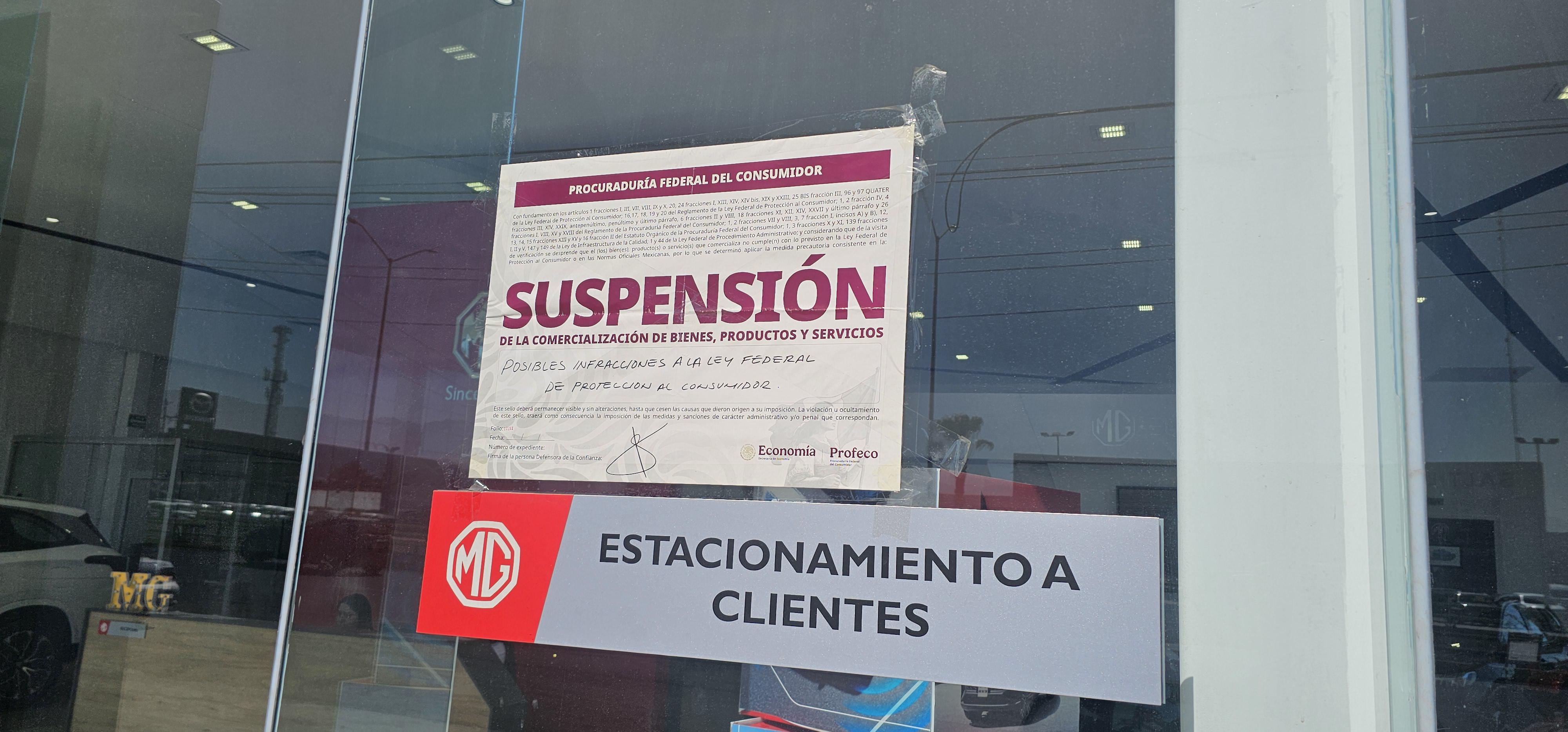 Personal de la Procuraduría Federal del Consumidor (Profeco) en Coahuila aplicó sellos de suspensión a la agencia de autos MG Saltillo. La medida se derivó de diversas quejas de clientes por la negativa o tardanza en el cumplimiento de las garantías vehiculares.