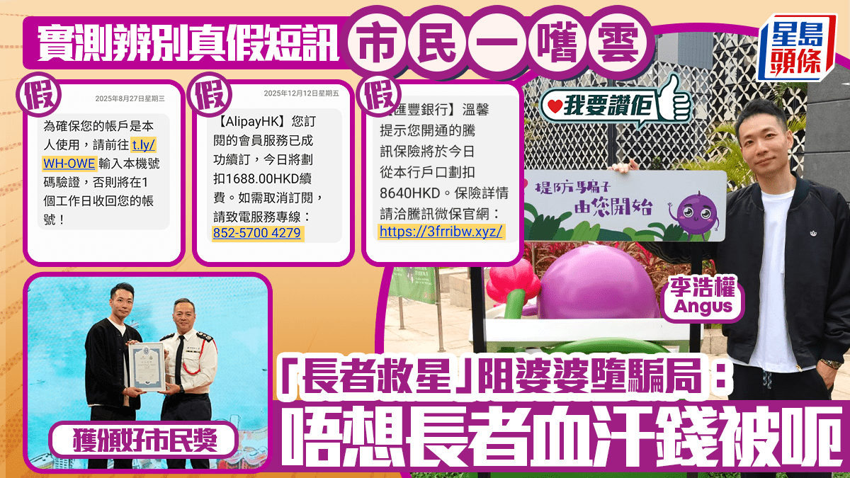 深水埗維修手機店主Angus,早前阻止兩名婆婆墮入投資騙局,獲得網民大讚封為「長者救星」。他熱心助人的事跡,不但獲星島新聞集團《我要讚佢》報道,更被警方嘉許授予「好市民獎」。他獲獎後坦言事發當刻憑良心做事,不想長者血汗錢被騙光,他亦寄語各行各業應及時伸出援手,為防止騙案發生出一分力。 「好市民獎頒獎典禮2025」日前於灣仔會展舉行,嘉許80名協助警方撲滅罪行的好巿民。現年36歲的手機維修店東主李浩