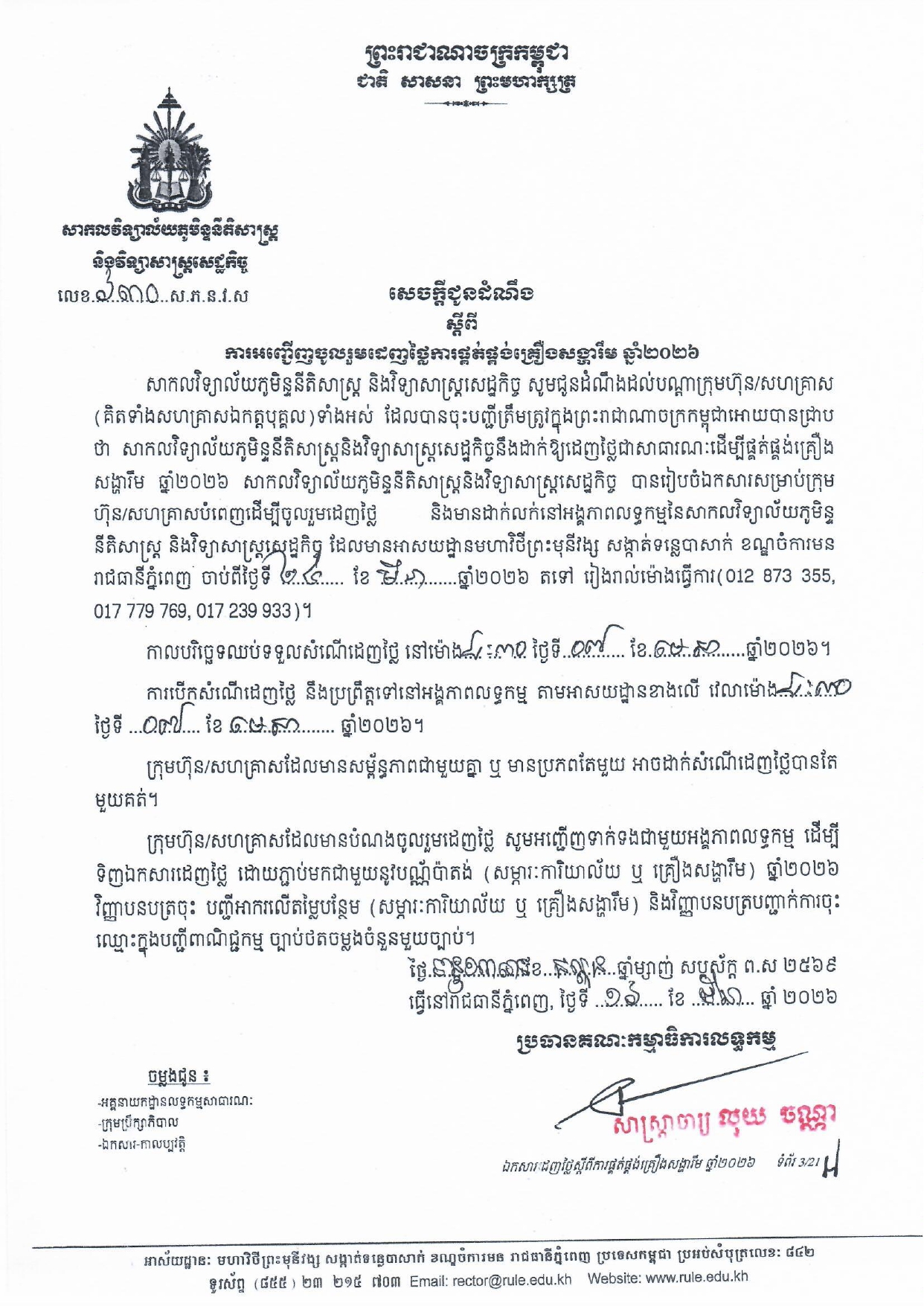 The post សេចក្ដីជូនដំណឹង ស្ដីពីការអញ្ជើញចូលរួមដេញថ្លៃការផ្គត់ផ្គង់គ្រឿងសង្ហារឹម ឆ្នាំ២០២៦ appeared first on Kampuchea Thmey Daily .