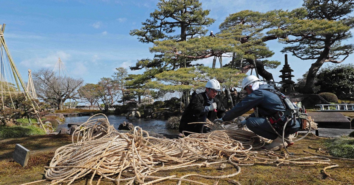 金沢・兼六園で雪吊りの取り外し作業 「終わる頃には桜咲く」
