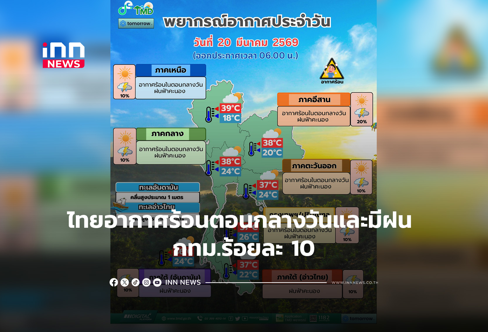 ประเทศไทยมีอากาศร้อนตอนกลางวันและมีฝนฟ้าคะนองบางแห่ง กรุงเทพปริมณฑลฝนร้อยละ 10 ส่วนภาคใต้ทะเลคลื่นสูง 1-2 เมตร