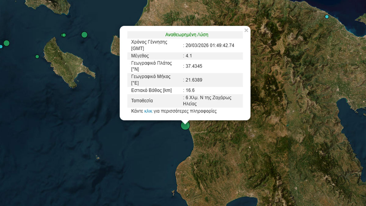 Το επίκεντρο εντοπίζεται 6 Χλμ. Ν της Ζαχάρως Ηλείας ενώ το εστιακό βάθος υπολογίζεται στα 16,6 χιλιόμετρα