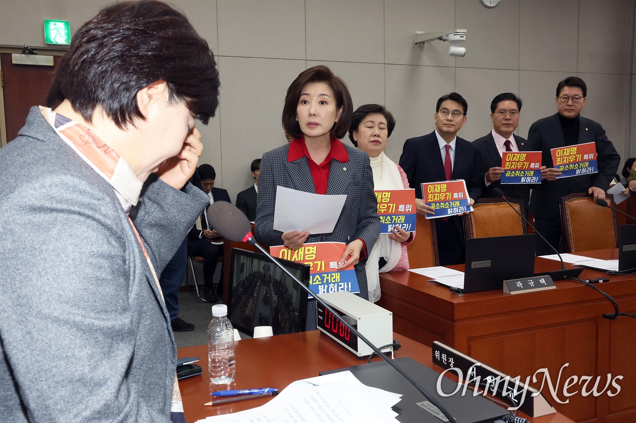 20일 국회 '윤석열 정권 정치검찰 조작기소 의혹 사건 진상규명 국정조사특별위원회(국조특위)' 첫 회의부터 여야가 충돌했다. 회의 시작 후 회의장에 들어온 국민의힘 의원들은 '이재명 죄지우기 특위 공소취소 거래 밝혀라'고 적힌 손피켓을 들고 회의장으로 들어와 위원장석 앞에 섰다. 앞서 사회를 맡은 박지원 더불어민주당 의원이 서영교 민주당 의원을 국조특위 위원장으로 선출한 이후의 상황이었다. 나경원 "야당이 들어오지도 않았는데..." 박지원 "나경원 의원만 참석한다고 해서, 조금 늦는다고 해서 제가 기다릴 필요 없이 하자고 했습니다." 전체 내용보기
