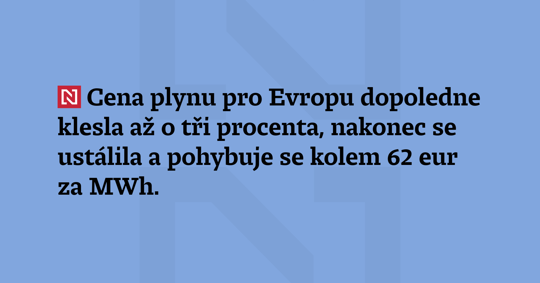 Cena plynu pro Evropu dopoledne klesla až o tři procenta, nakonec se ustálila a pohybuje se kolem 62 eur za MWh. Včera cena vzrostla až o 35 procent. (ČTK)